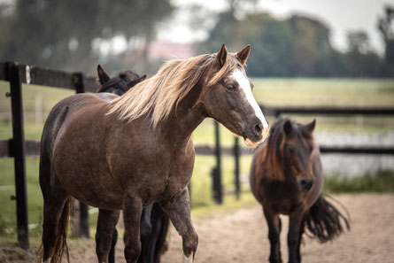 Harry geht gerne ins Gelände, ist da aber immer flott unterwegs. In seinem früheren Leben ist er erfolgreich bei Ponyrennen dabei gewesen und ab und zu gehen die Pferde auch heute noch mit ihm durch :-)